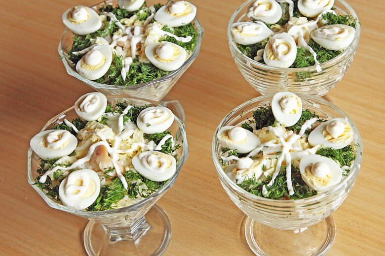 6.Зелень укропа вымойте, обсушите, мелко нарежьте и посыпьте сверху порции салата. Очищенные перепелиные яйца разрежьте вдоль пополам. Полученные половинки разложите на салат и нанесите на них немного майонеза.