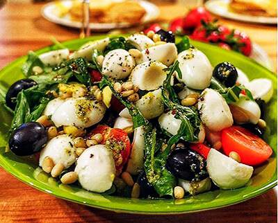 7. Если из каких-либо причин вы не имеете возможности приготовить или купить песто, есть вариант более простой заправки для этого салата: оливковое масло + тертый на мелкую терку чеснок + соль и перец черный молотый по вкусу.