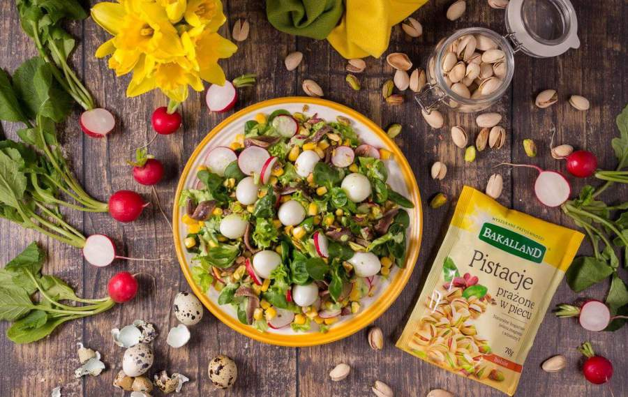 5. Зелень на блюде приправьте небольшим количеством соли и перца, а затем выкладывайте вперемешку поочередно редис, яйца, анчоусы, отцеженную кукурузу. Полейте все сверху соусом и посыпьте фисташками.