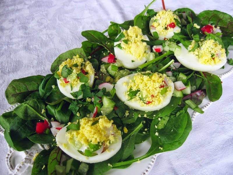 6.Оставшуюся нарезанную овощную смесь редиски с огурцом и зеленью, которая не поместилась в белки яиц, разложите на зелень между наполненными яйцами. Слегка сбрызните все сверху оливковым или рапсовым маслом.