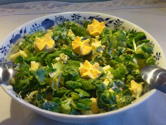 7.Полейте продукты в салатнике заправкой и аккуратно перемешайте. Украсьте сверху листиками салата и яичными желтками. Зимний яичный салат «Весенняя поляна» готов. Подавайте его сразу после приготовления.