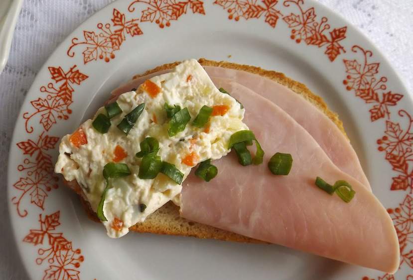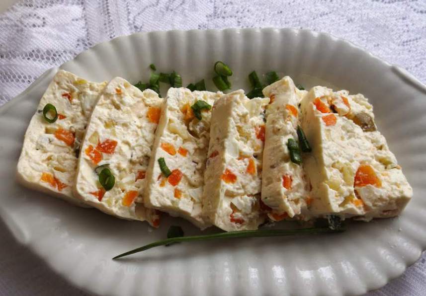 8. Когда салат полностью застынет, достаньте его из коробки, нарежьте ломтиками, выложите на блюдо и, посыпав зеленым луком, подавайте к праздничному столу. А также наслаждайтесь в одиночку с куском хлеба, мясом или просто так.