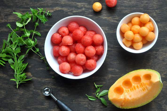 1. Из мякоти спелого арбуза удалите семечки и вырежьте специальной круглой ложкой-нуазеткой арбузные шарики. Если у вас нет такой ложки, нарежьте арбуз кубиками небольшого размера.