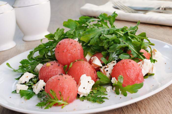 Очень красиво смотрятся салаты из арбуза, оформленные в виде сочных красивых шариков. Острые края нуазетки обеспечивают получение фрагментов арбуза и других ингредиентов салата идеальной сферической формы.