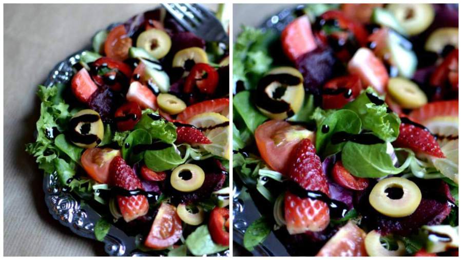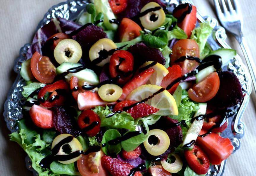 7. Яркий и очень вкусный салат с клубникой и печеной свёклой готов. Его насыщенный пряный вкус отлично сочетается с мясом на гриле.