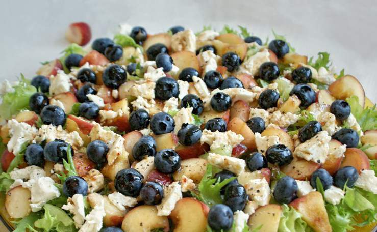3. Сверху на листья салата в произвольном порядке разложите кусочки персиков и козьего сыра вперемешку с ягодами голубики.