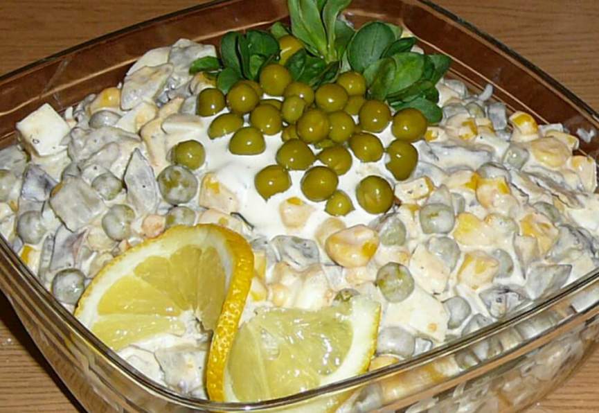 4. Кукурузу и зеленый горошек, слив рассол, пересыпьте из банок в миску, добавьте туда измельченный топинамбур, огурцы и яйца. Посолите, хорошо поперчите и тщательно перемешайте.