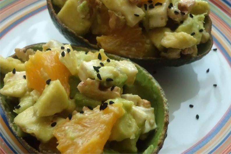 6. Приготовленный салат разложите в две «мисочки» из половинок авокадо и посыпьте сверху черным тмином. Салат из авокадо с сыром бри можно подавать к столу.