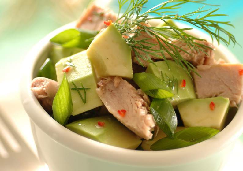 6. Салат из авокадо с тунцом желательно подать к столу сразу после приготовления. В этом аппетитном блюде все ингредиенты гармонично сочетаются между собой, а авокадо выгодно подчеркивает вкус тунца.