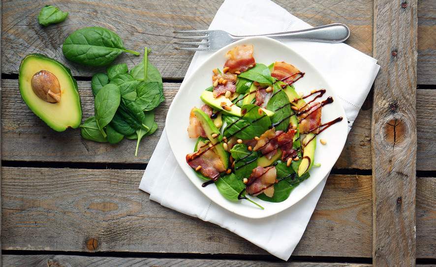 5. На блюдо для салата уложите слайсы авокадо, посыпьте сверху листья шпината, на него разложите чипсы бекона, посыпьте румяными орешками и полейте салат заправкой, хорошо перемешав.