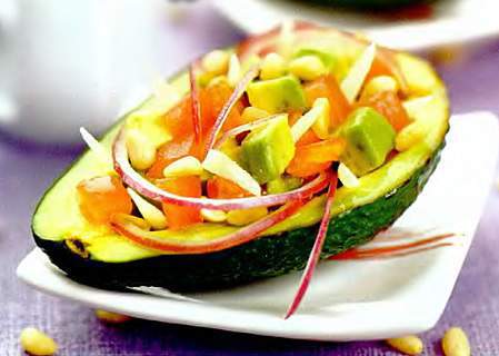 8. Аккуратно выложите ваш готовый салат в половинки авокадо, можно и в салатницу. Сверху полейте салат соусом и посыпьте кедровыми орехами (вкуснее будет если вы сначала обжарите орехи для салата). Салат с кедровыми орехами и авокадо готов, подавайте этот салат охлажденным.