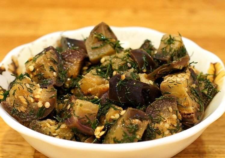 5. Салат из баклажанов с чесноком подавайте к столу в охлажденном виде, посыпая мелко рубленой зеленью укропа, кунжутом и тонкими кольцами лука.