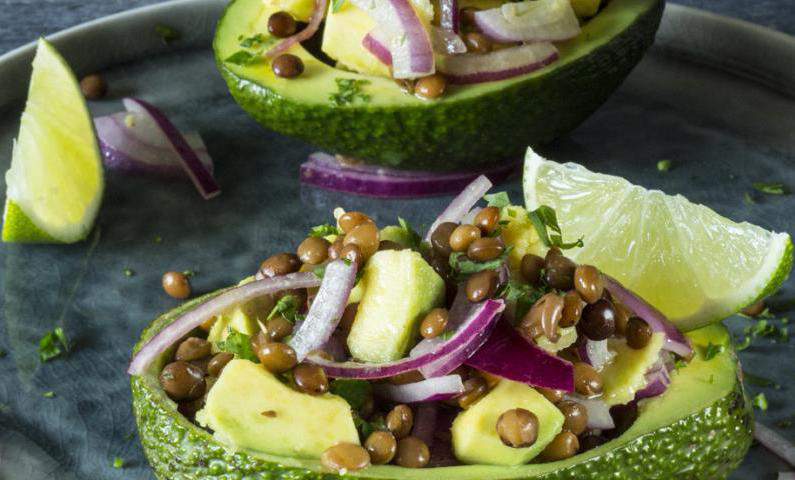 6. Посыпьте салат в половинках авокадо кинзой. Разделите оставшуюся половину лайма на дольки. Подавайте салат из чечевицы с авокадо вместе с дольками лайма.