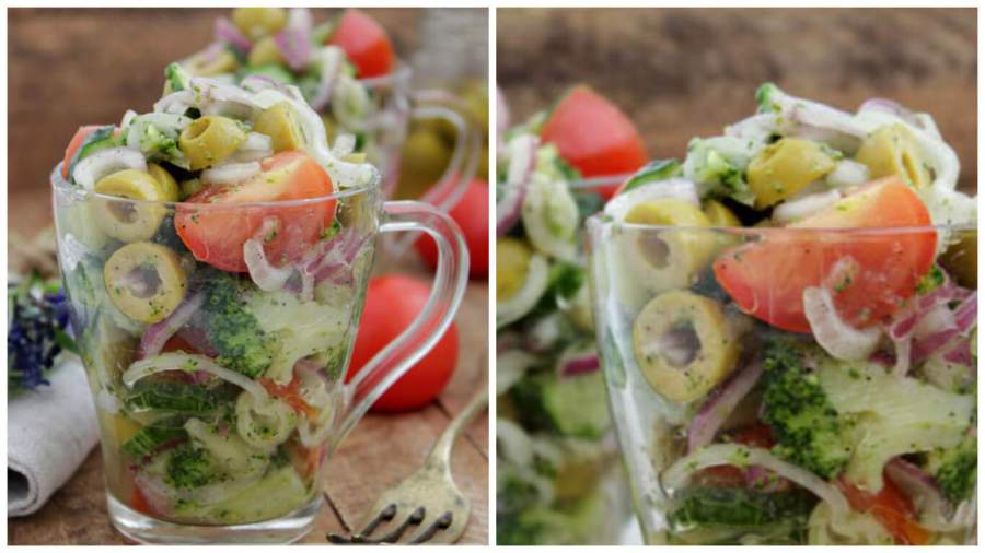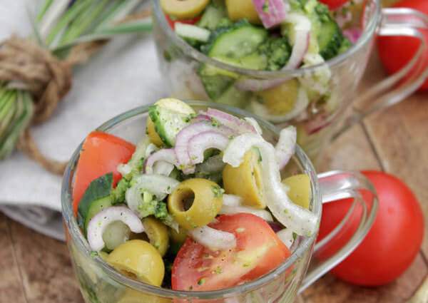 6. Сложите в контейнер брокколи, оба вида лука, помидоры, огурцы и оливки, полейте заправкой и хорошо перемешайте. Оставьте салат на 15 минут мариноваться под закрытой крышкой.