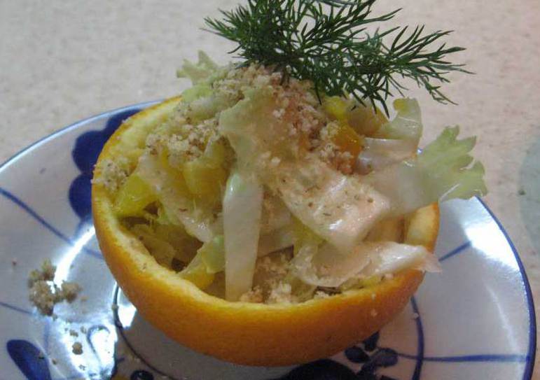7.Разложите салат в порционные стаканы или креманки. Две половинки апельсина тоже используйте в качестве порционных емкостей для салата.