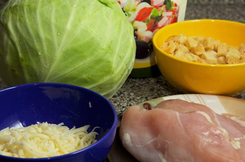 5. Оставьте мятую с солью капусту на 10-15 минут, а сами займитесь курицей. Остывшее филе нарежьте кубиками, соизмеримыми с сухариками.