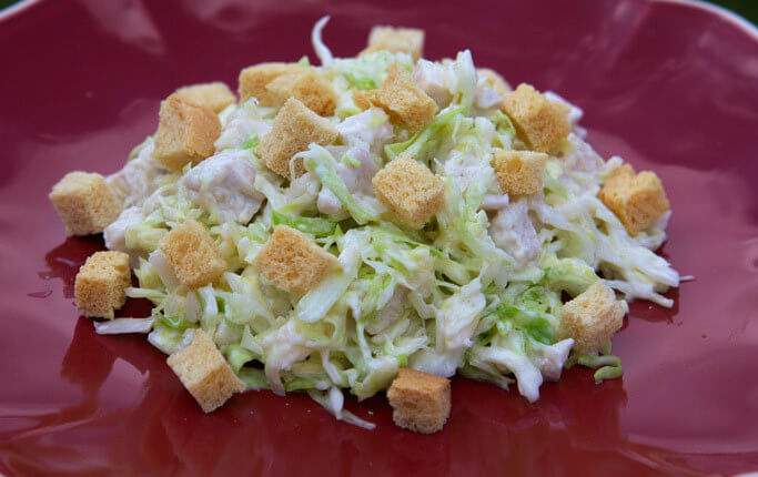 8. Переложите салат из миски в салатник, посыпьте сухариками и подайте к столу. Салат из капусты с сухариками и курицей подавайте в дополнение к обеду или как самостоятельную закуску на ужин. Сухарики следует добавлять непосредственно перед подачей, чтобы они не размякли и не утратили хрустящие свойства.