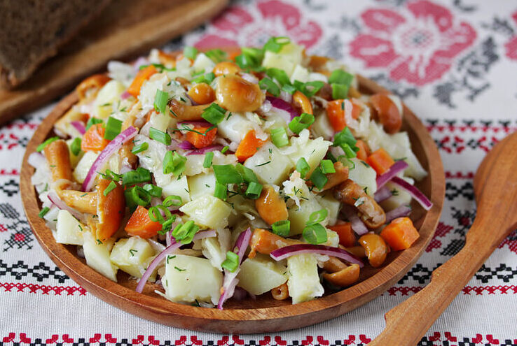 Готовим картофельный салат с маринованными грибами и квашеной капустой