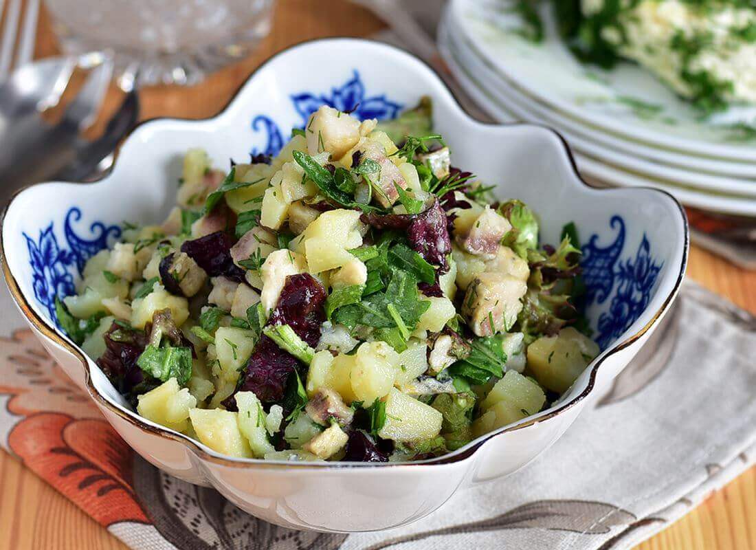 Сельдь отлично сочетается с картошкой в виде самостоятельной закуски и в самых разных блюдах, в том числе и в салатах. Разновидностей аппетитных салатов с сельдью в главной или второстепенной роли известно немало. Предлагаем вашему вниманию интересный рецепт картофельного салата с сельдью и зеленью.
