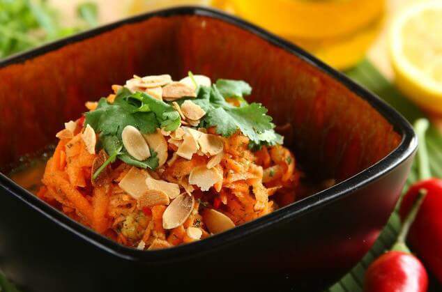 8. Пряный салат из моркови по-индийски подавайте к столу, посыпав поджаренными хлопьями миндаля и украсив листиками кинзы.