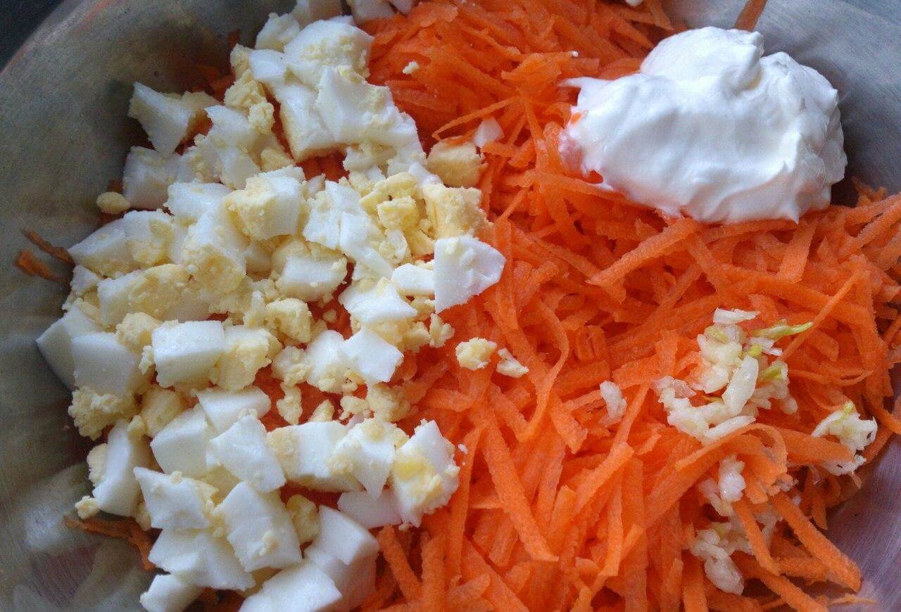 5.Немного сыра оставьте для декора, а остальной сложите в глубокую миску, добавьте тертую морковь, яйца, чеснок и перемешайте. Полейте смесь майонезом и снова перемешайте.