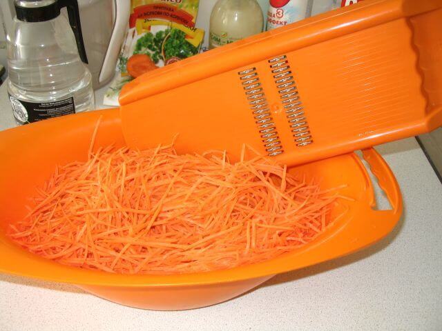 Если терки для корейской моркови нет, придать измельченной моркови соответствующую форму можно, расположив бочек натираемого продукта почти параллельно поверхности терки. В этом случае получите длинные, но тонкие ломтики.