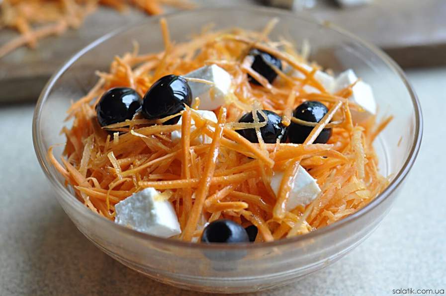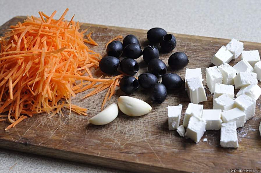 Готовим салат из моркови с сыром, оливками и тмином