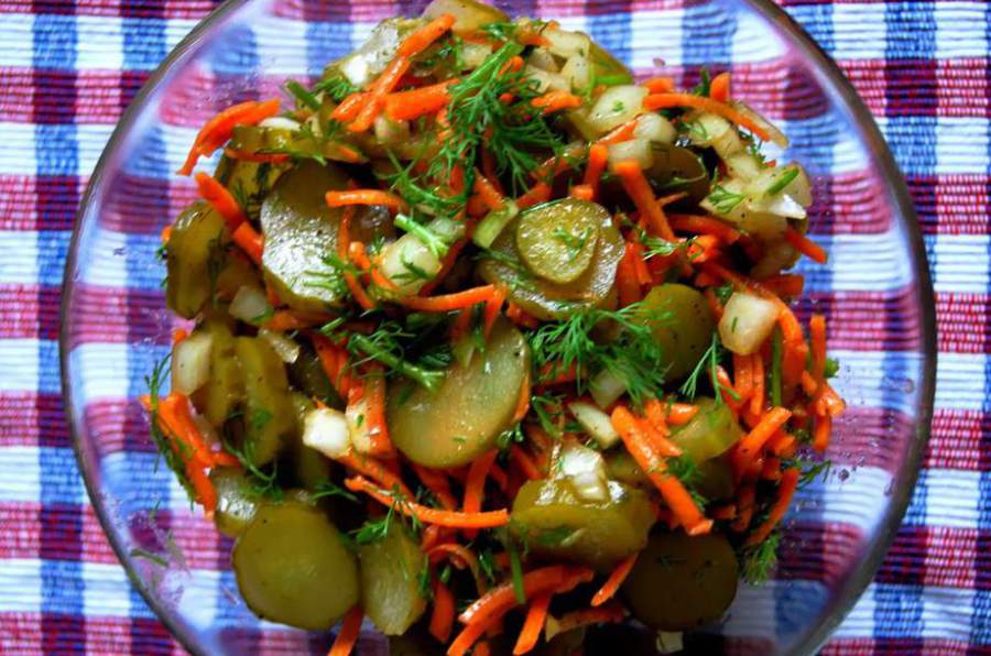 8. Салат из маринованных огурцов с морковью и луком подайте к мясному блюду, к горячей вареной или печеной картошке.