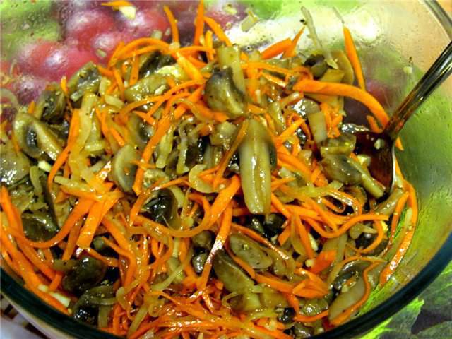 8. В небольшой посуде подогрейте растительное масло и залейте им салат, перемешайте и оставьте в холодильнике на 2 часа.