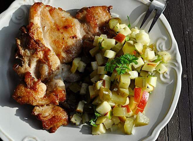 5. Салат из соленых огурцов с яблоками и луком лучше подать, когда он настоится. Поставьте миску с салатом в холодильник на 30 минут, а затем разложите в порционные тарелки, креманки или фужеры и подайте к столу, посыпав зеленью петрушки, как самостоятельную закуску, к мясу, ветчине или рыбе в качестве гарнира.