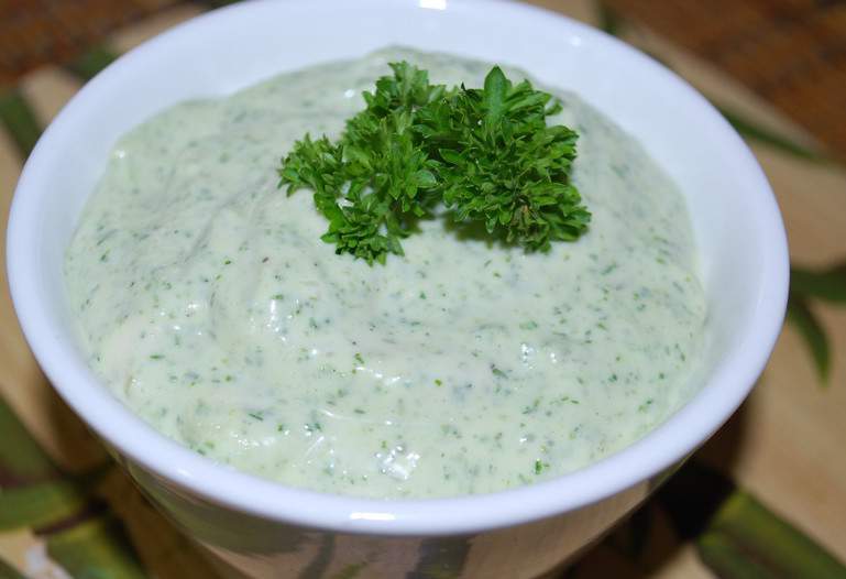 5. Приготовьте чесночный соус. Для этого смешайте майонез с рубленой зеленью, специями и чесноком, пропущенным через пресс или натертым на мелкой терке.