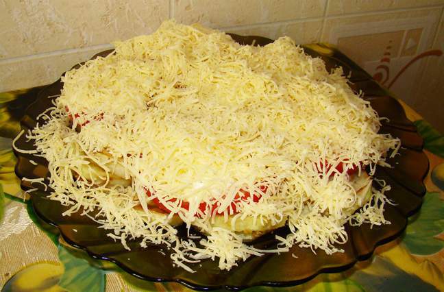 7. Твердый сыр натрите на терку с мелкими или средними отверстиями и обильно притрусите им еврейский салат из кабачков.
