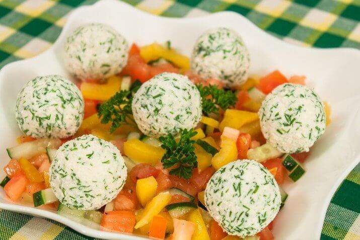 Всем любителям сыра и блюд из него понравится этот простой в приготовлении, но оригинальный по способу подачи салат. Предлагаем вашему вниманию интересный рецепт летнего овощного салата с сырными шариками, который не только имеет отличный вкус, но и выглядит очень даже празднично и привлекательно.