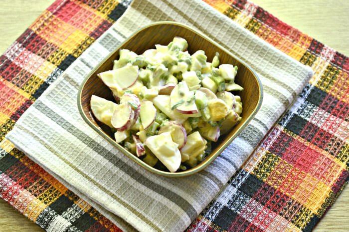 9.Простой, но оригинальный на вкус овощной салат из ревеня с редисом готов. Переложите его из миски в салатник или порционные тарелки и сразу подавайте к столу. Настаивание не желательно, так как редис под действием соли истечет соком и сделает сметанную заправку жидкой с потерей вкуса и внешнего вида.