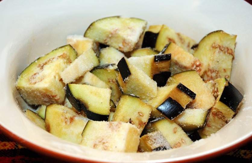 2. Нарезав баклажаны на кусочки, посыпьте их солью и оставьте на 30 минут, желательно на наклонной доске, чтобы стекала горькая жидкость. Затем кусочки баклажанов промойте.