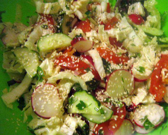 Овощной салат с редисом и семенами кунжута очень легкий, это идеальный вариант для ужина. Предложенный рецепт поможет вам вкусно покушать и всегда оставаться в форме. Свежий овощной вкус станет интереснее благодаря семенам кунжута. Попробуйте приготовить этот салат, и он вам обязательно понравиться.