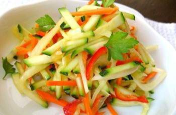1. Для начала вымойте овощи для салата. Затем очистите кабачки от кожицы. Натрите кабачки на терке в виде крупной соломки, немножко подсолите и оставьте ненадолго, чтобы избавиться от лишней жидкости.