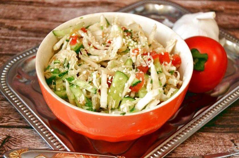 5.Готовый весенний салат из пекинской капусты переложите из миски в салатник, посыпьте сверху еще небольшим количеством кунжута и подавайте к столу.