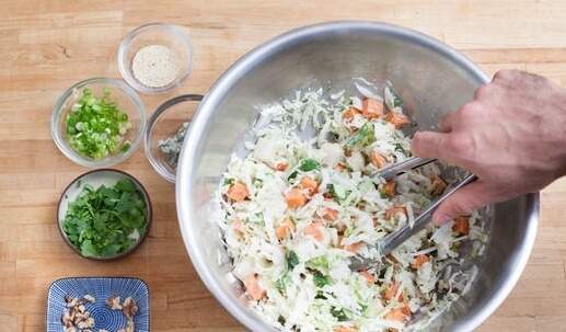 5.В большую просторную миску сложите измельченную пекинскую капусту, соедините ее с огурцами, грушей, отварным бататом, половиной грецких орехов, зеленого лука и кинзы. Добавьте соус и хорошенько перемешайте.