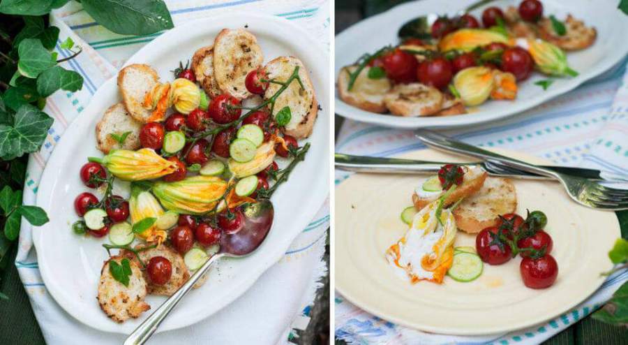 Тёплый салат из фаршированных цветков цуккини с помидорами