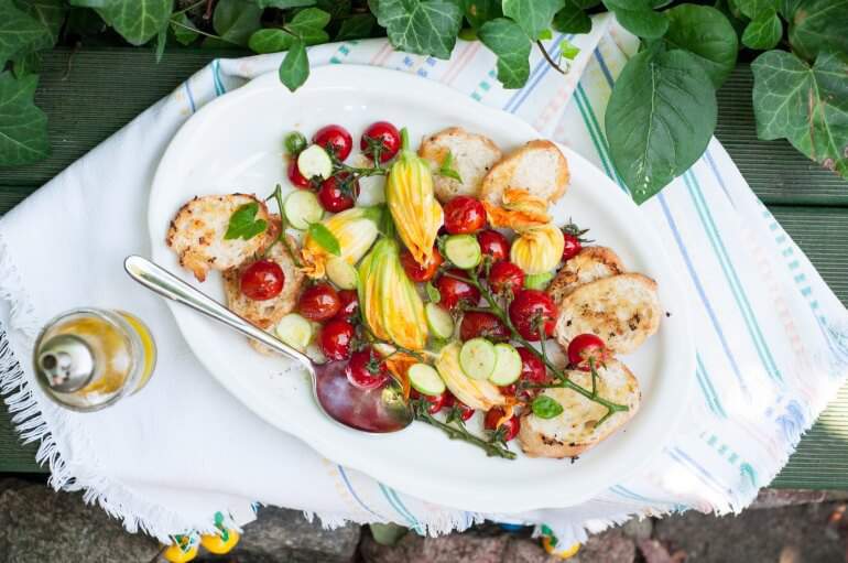 5. На блюдо или в порционные тарелки разложите все ингредиенты салата – тёплые коктейльные помидорчики, фаршированные цветки, кружки кабачков и гренки. Сверху посыпьте солью и перцем, сбрызните оливковым маслом и бальзамическим уксусом.