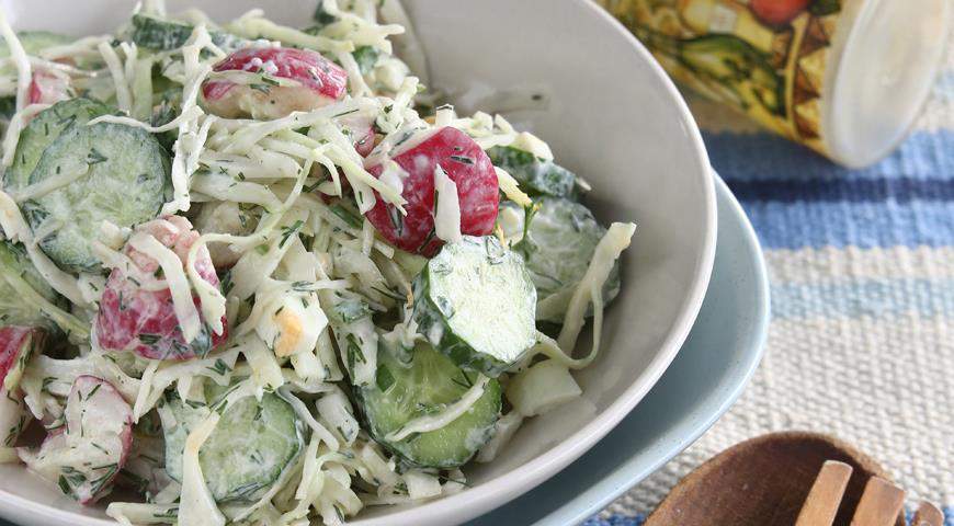 Измельчение редиса путем раздавливания, а не нарезания является фишкой этого салата. В этом случае ломтики редиса лучше пропитываются заправкой, кардинально изменяя вкус.