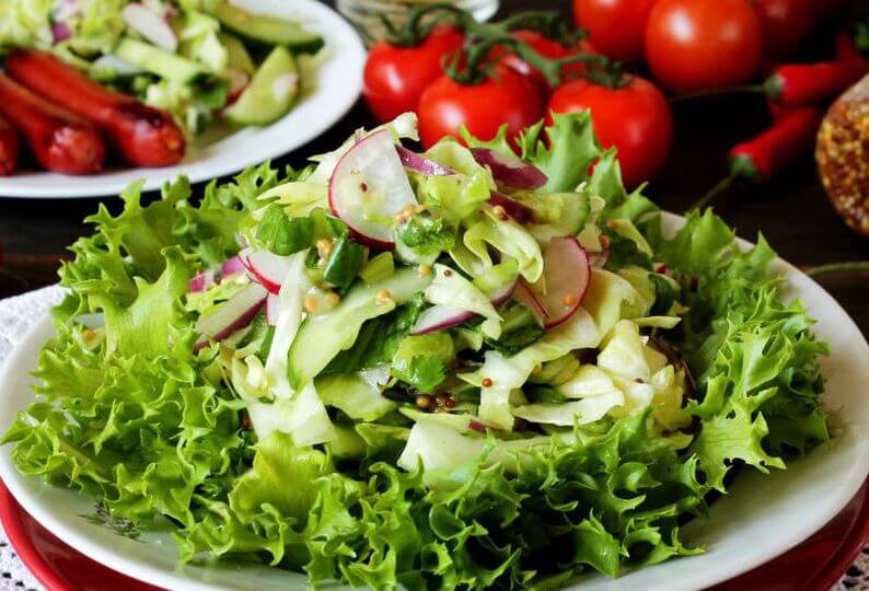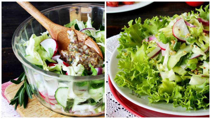 7. Полейте нашинкованные овощи заправкой и перемешайте. Выложите на порционную тарелку сначала листья салата фризе, сверху выложите с остальными ингредиенты с заправкой. Весенний салат со свежими овощами и зеленью готов к подаче.