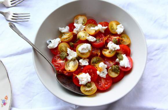7. Салат из помидоров с козьей рикоттой ешьте сразу. Подавайте его со свежим хлебом, которым удобно собирать с тарелки сладкий томатный сок.