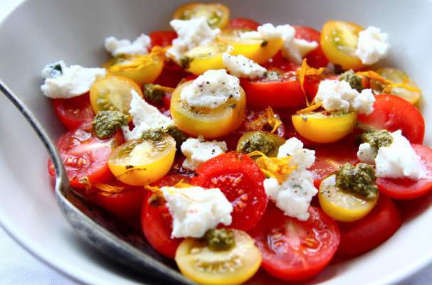 6. Посыпьте сверху раскрошенной рикоттой, полейте оливковым маслом и украсьте лепестками календулы. Лучше свежими, но можно и сушеными.