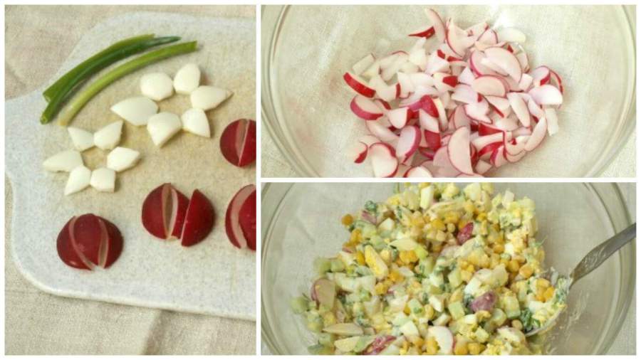 5. Нарежьте кубиками яичные желтки и оставшиеся белки. Смешайте яйца с огурцом и редисом, добавьте в салат консервированную кукурузу.