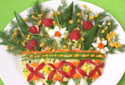 7. Теперь займитесь декором. Нижнюю часть салата украсьте в виде вазона, а верх оформите цветками из редиса и яиц.