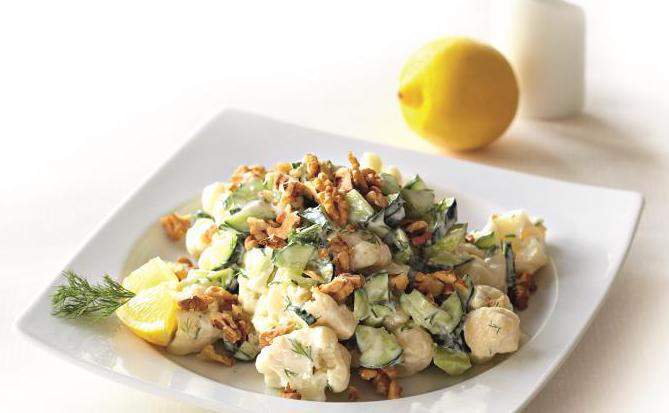 6. Положите в салатное блюдо цветную капусту, добавьте огурцы, полейте заправкой и перемешайте. Подавайте салат из цветной капусты с огурцами к столу, посыпав его грецкими орехами.