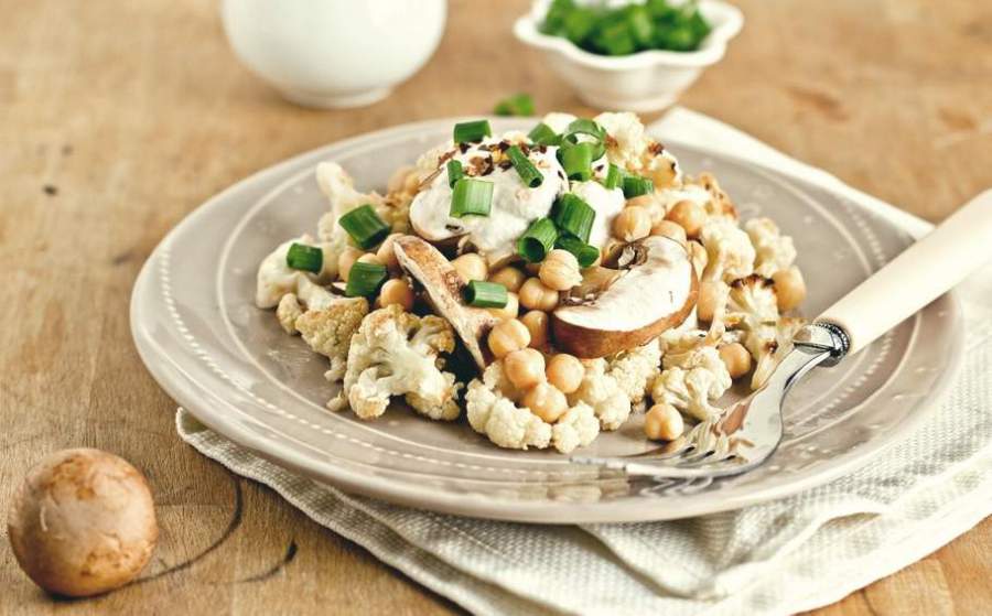 5. В глубокой миске смешайте запеченную цветную капусту с отварным нутом и раздавленным вилкой запеченным зубчиком чеснока.