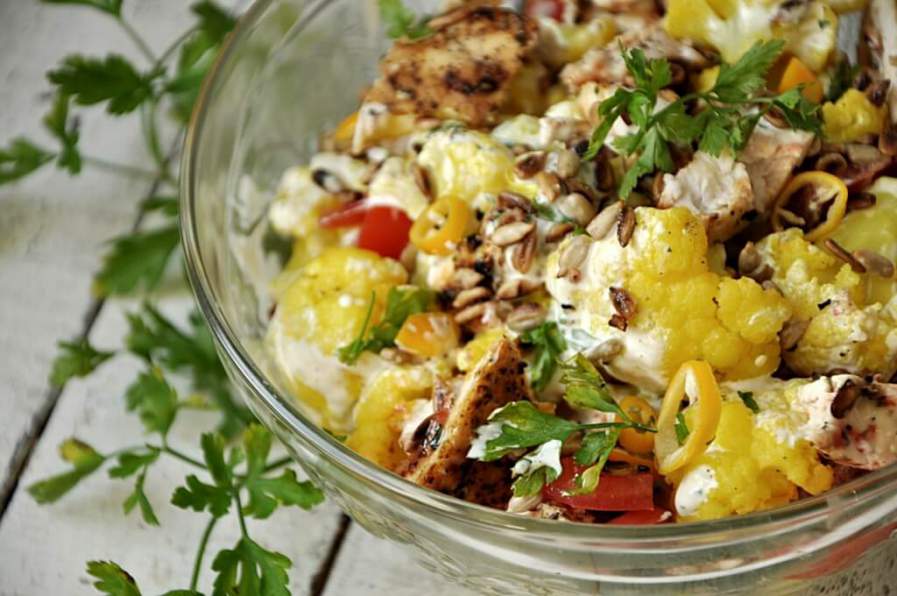 8. Сложите желтые вареные соцветия цветной капусты в миску, перекладывая курятиной, порезанной на мелкие ломтики, кубиками помидора, колечками желтого перца.